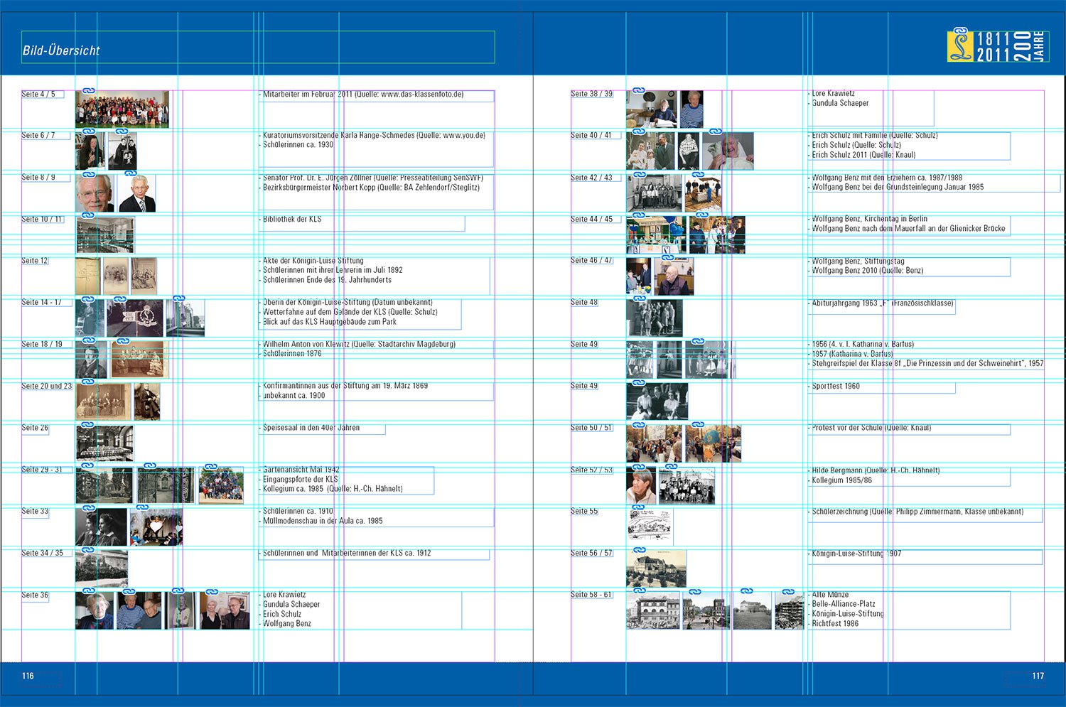 Am folgenden Beispiel kann man sehen, aus wie vielen Einzelteilen eine Seite im Layout entsteht und wie dann das fertige Produkt aussieht.