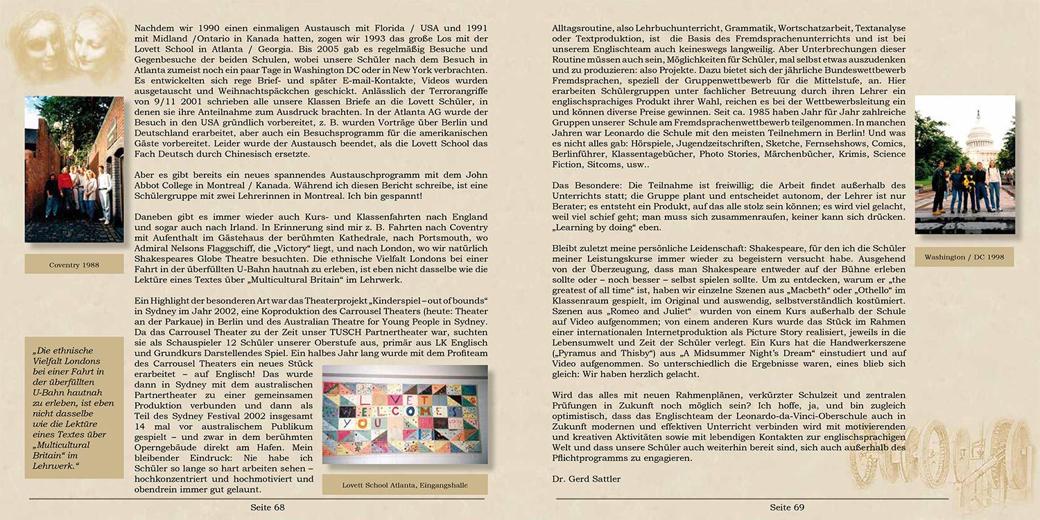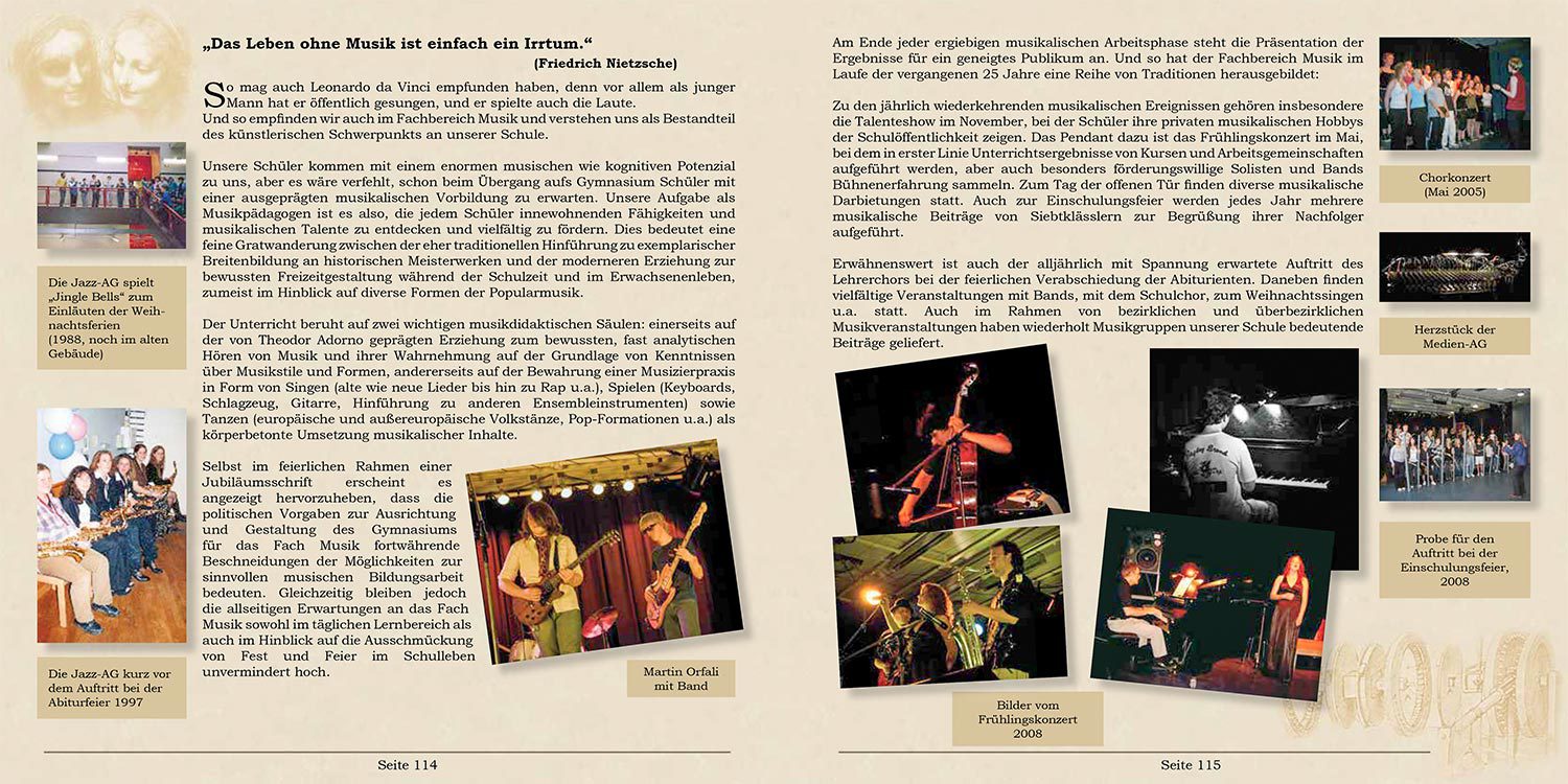 Leonardo da Vinci war ein Mann der Wissenschaft und der Kunst. Diese Schwerpunkte pflegt auch das Leonardo-da-Vinci-Gymnasium. In der Festschrift zum 25-jährigen Bestehen wurde das auf über 200 Seiten durch Fotos und Berichte zum Ausdruck gebracht. Das Layout sollte dabei nicht akribisch und streng erscheinen, sondern die bunte Vielfalt des Schullebens darstellen.