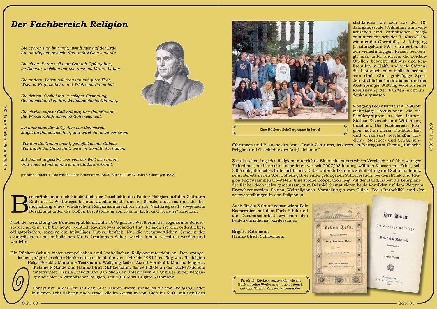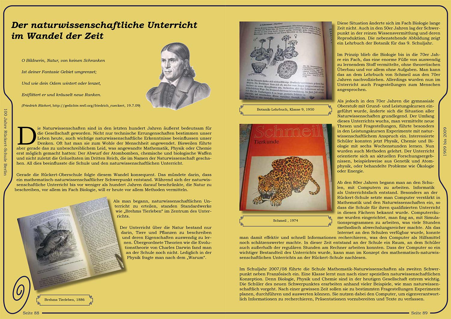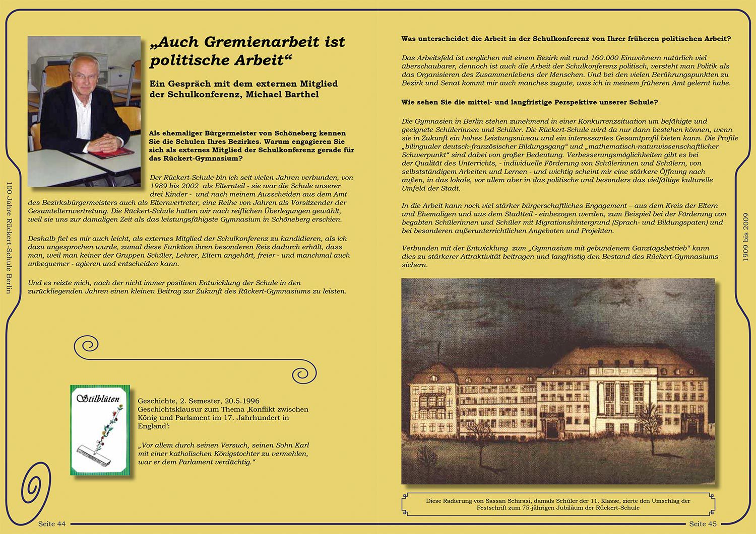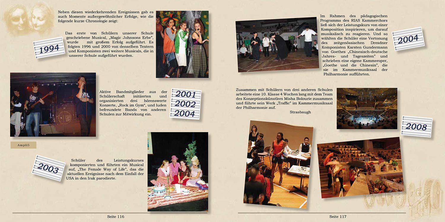Zum 100-jährigen Bestehen des Rückert-Gymnasiums wünschte man sich eine Festschrift, die die Geschichte von den Anfängen des Gymnasiums bis heute widerspiegelt und beim Erscheinungsbild die architektonische Epoche des alten Gebäudes berücksichtigt. Zitate, Stilblüten, Fotos und Texte wurden dann in enger Zusammenarbeit mit dem verantwortlichen Lehrer zu einem Gesamtwerk zusammengesetzt.
